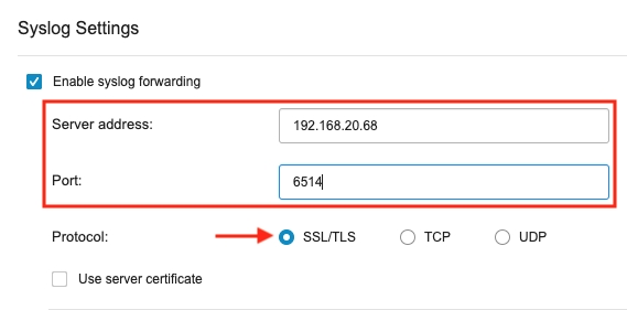 • Server Address: Enter the IP address of the local Radiant Security Syslog Collector previously deployed